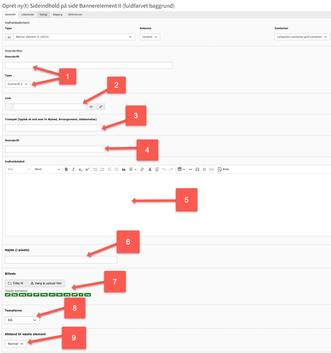 2. Link: Insert the page that the banner element should link to. This should be in the form of a web address (e.g., au.dk) or a page ID (e.g., 121721).