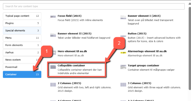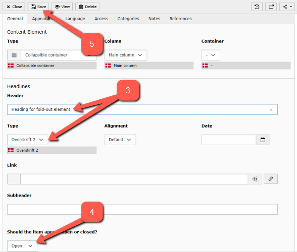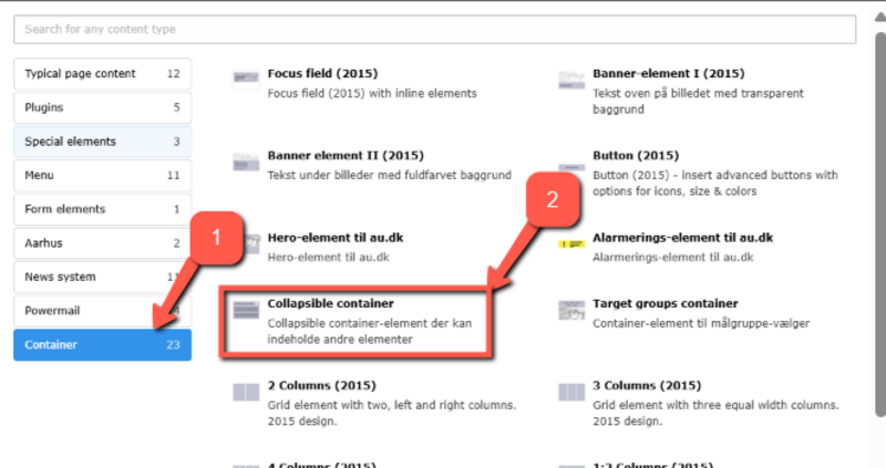 When you need to provide users with an overview of a large amount of content, you can use collapsible elements. You can choose whether the element should be opened or closed by default. When the element is closed, only the heading is visible while the content is hidden when the page is opened. It requires an extra click for the user to access the relevant content when the element is expanded; however, it allows for a quick overview if a page contains a lot of content.