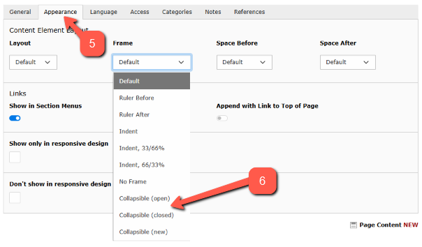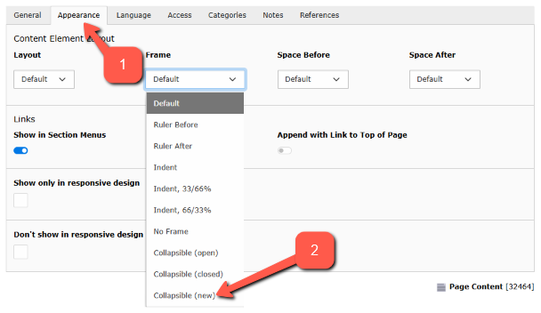 Alternatively, you can enable collapsible functionality for Text or Text & Images elements individually. You do this in the Appearance tab of the element, as shown below. This method is suitable if you only have one element that needs collapsible functionality.