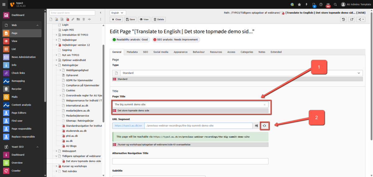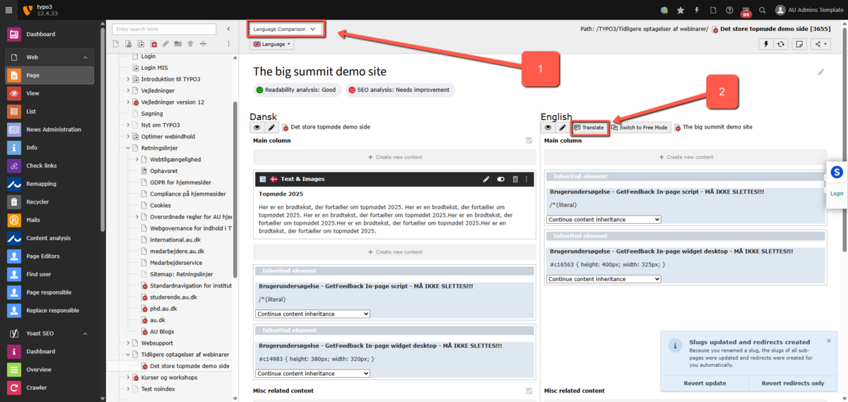 You will now have both a Danish and an English version of the page. For more details, see the guide on URLs for translated pages.