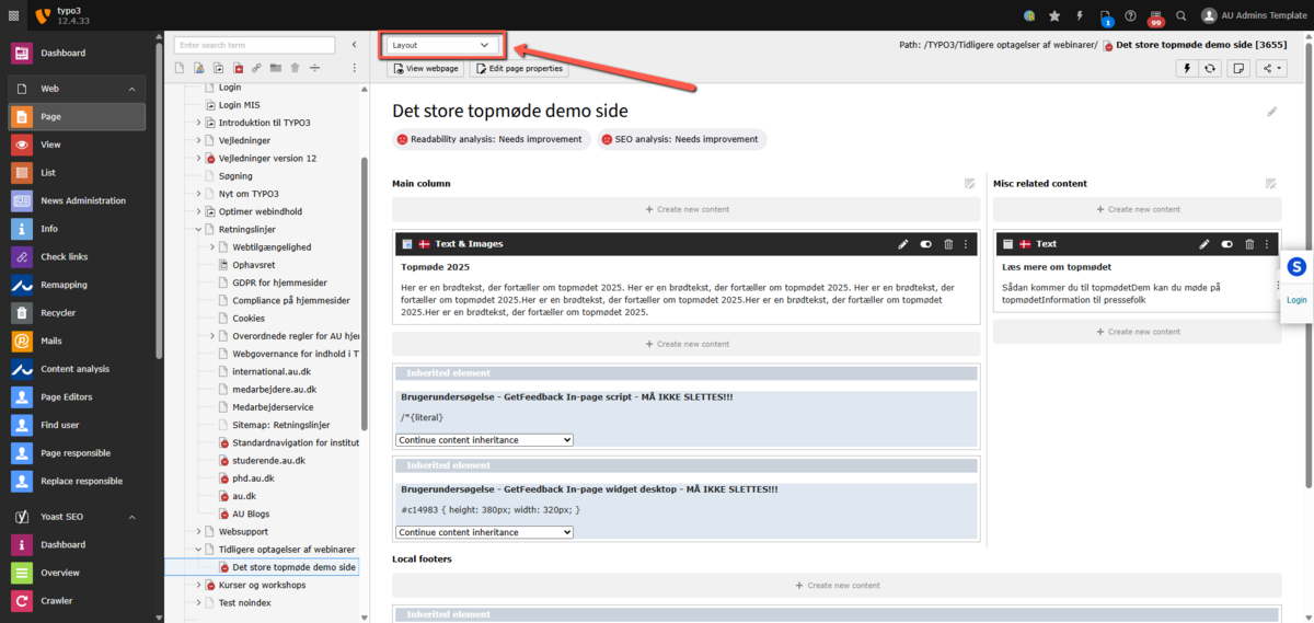TYPO3 is configured to display pages in the backend using Layout, as shown here. This view offers the advantage of focusing on one language at a time, thus providing more screen space to display content elements.