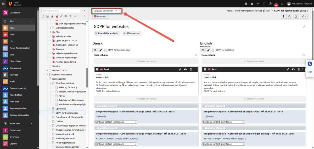 Here you will find a guide for translating pages and elements in TYPO3. The guide is based on pages with Danish as the default language being translated into English. The process is the same if you are working with a page with English as the default language being translated into Danish, German, or Spanish.