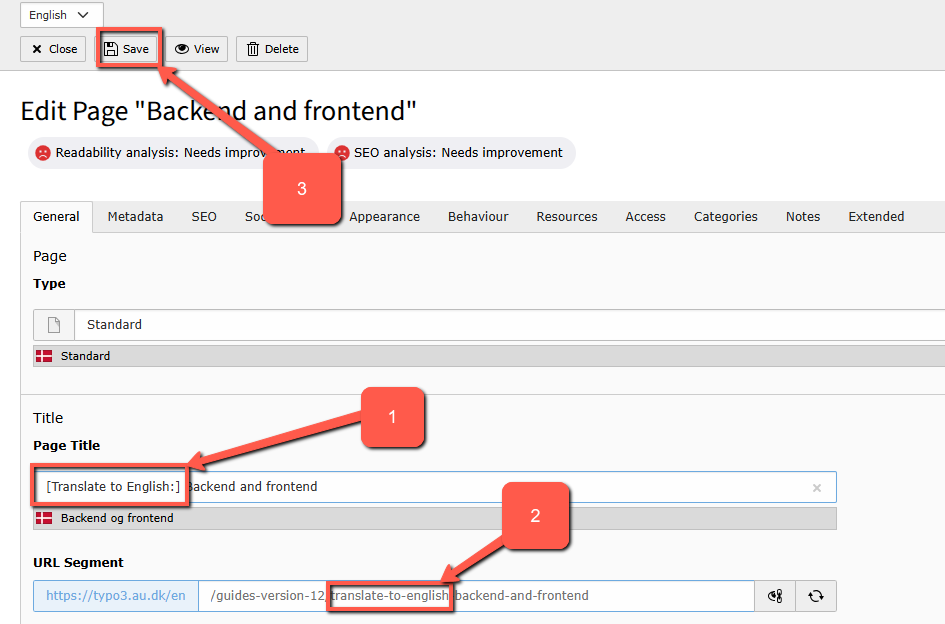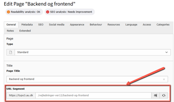 For example, the part after the domain in the URL for this page on typo3.au.dk would be the slug – that is "/en/guides/page-setup/urls-in-typo3".