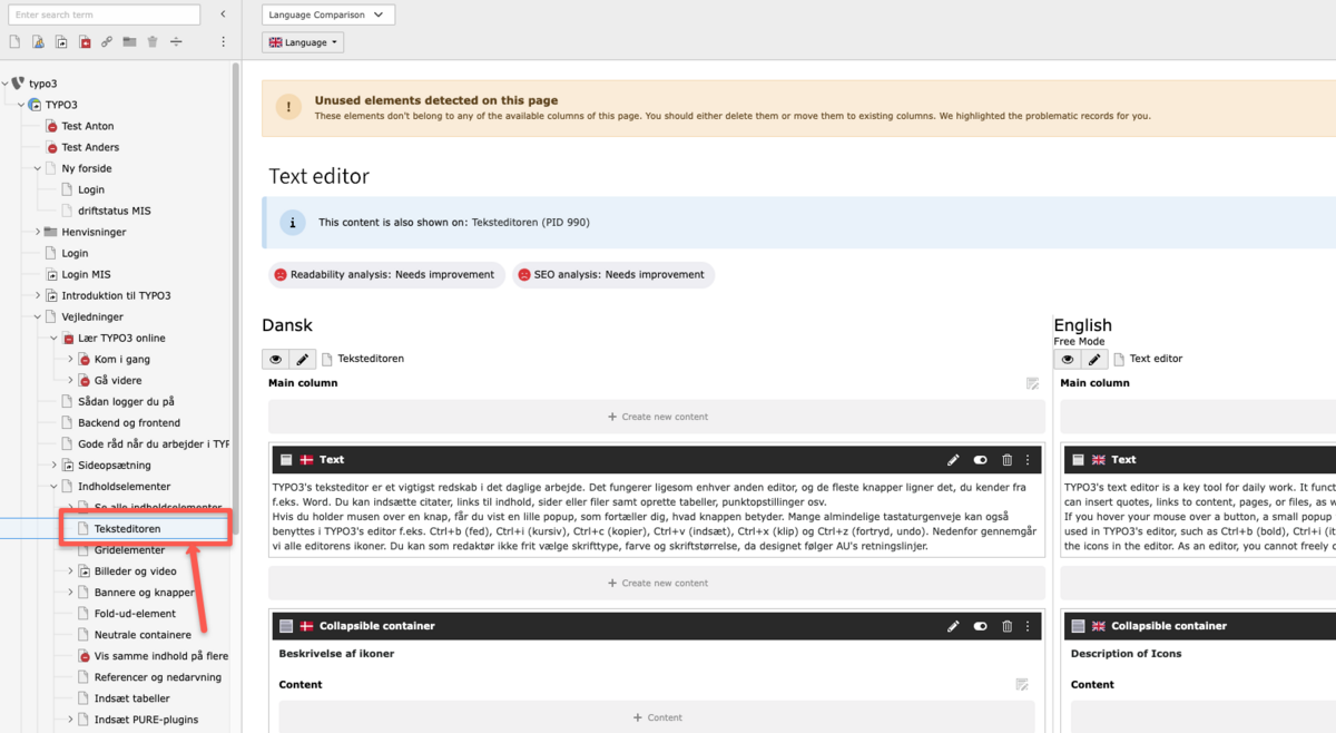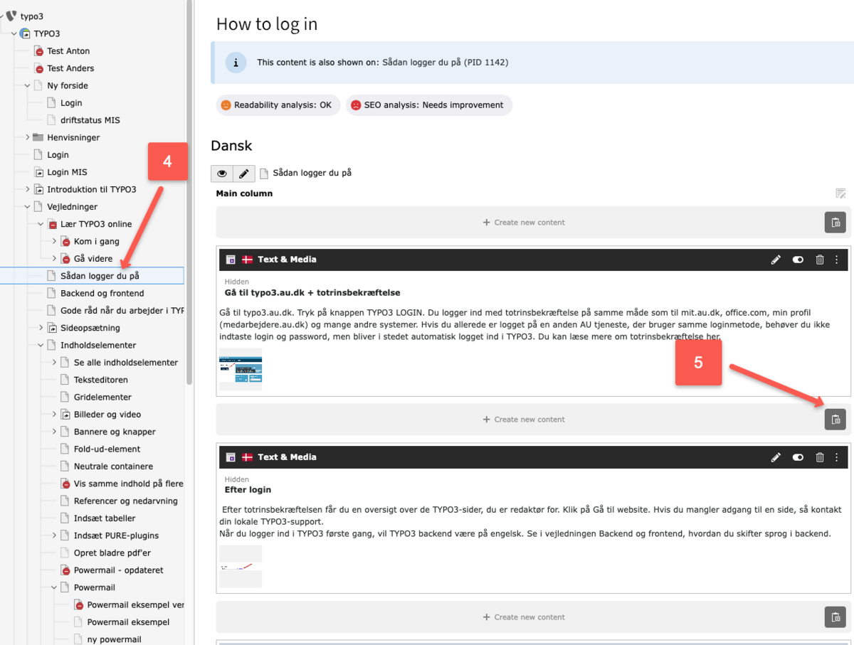 1) Click on the page where the content element to be inherited is located. Find the correct content element and click the pencil icon to edit it.