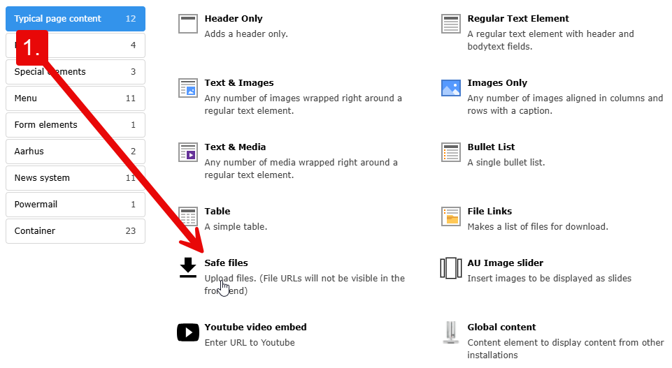 You can find the TYPO3 element Safe files (also known as the vault) under the tab Typical page content when creating a new content element. When you create links to your files via Safe files, they receive a URL where the file name does not appear.