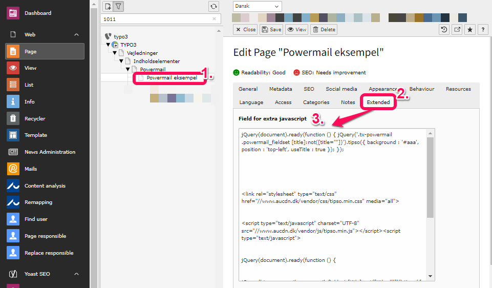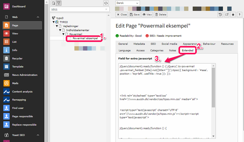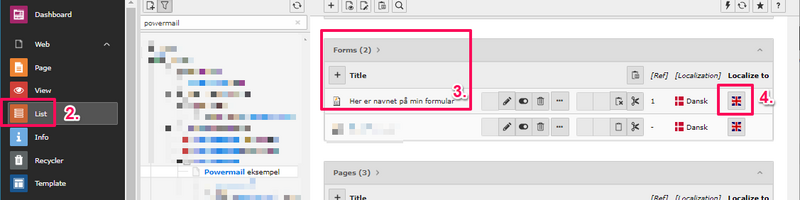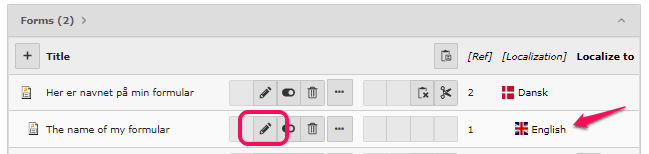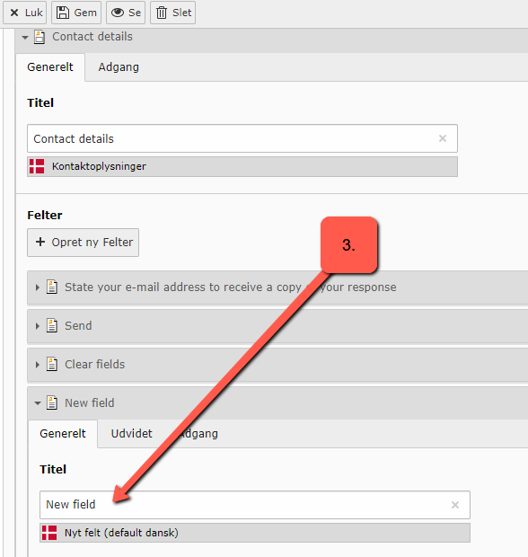 We assume that your Powermail has been translated according to the guide "Translate Powermail to another language" above. If you want to add a new field, it must be done in the form's original language (in this example, Danish). You will then translate your new field in the form's translation as shown below. Note: Avoid translating via List view.