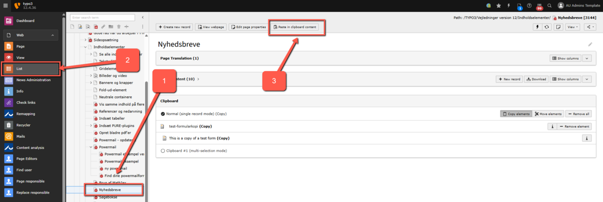 Navigate to the page where you want to place the Powermail form and paste it there. (Look for a small icon "Paste clipboard content" at the top of the page.)