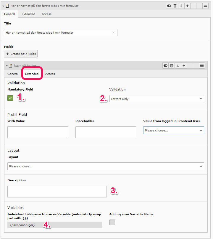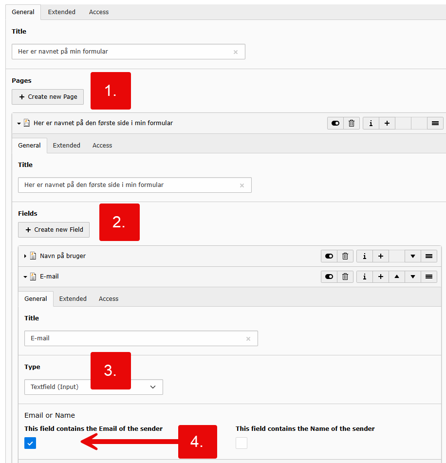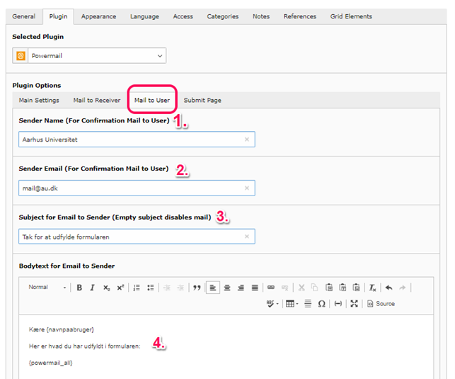 If you want users to receive an email (confirmation email) after they have filled out and submitted the form, you need to complete the following four points under Mail to User. Note: If the user should NOT receive a confirmation email, the Sender tab (Mail to user) should NOT be filled out.
