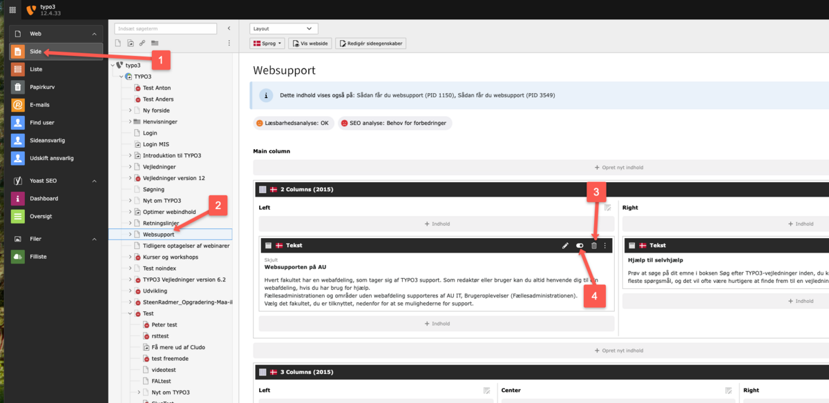 5. Elementet vil nu være kopiret over til den nye side. Elementet vil som default være skjult, når det bliver kopiret over, så hvis man ønsker, at elementet skal vises på siden, skal man klikke på vis-skjul-ikonet.