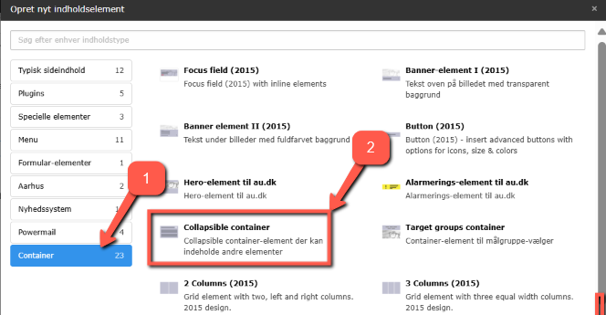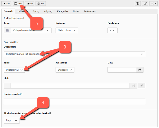 Vælger du en fold-ud-container, kan du placere de elementer, du har behov for, i den – samlet under ét. Fold-ud-containeren finder du under fanebladet Container (se Indsæt nyt element). Metoden er anvendelig, hvis du gerne vil have mere end ét element indeni din fold-ud-container.