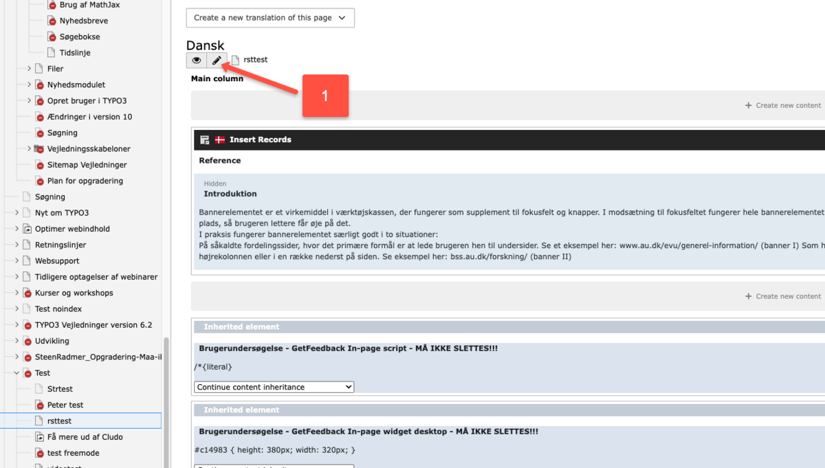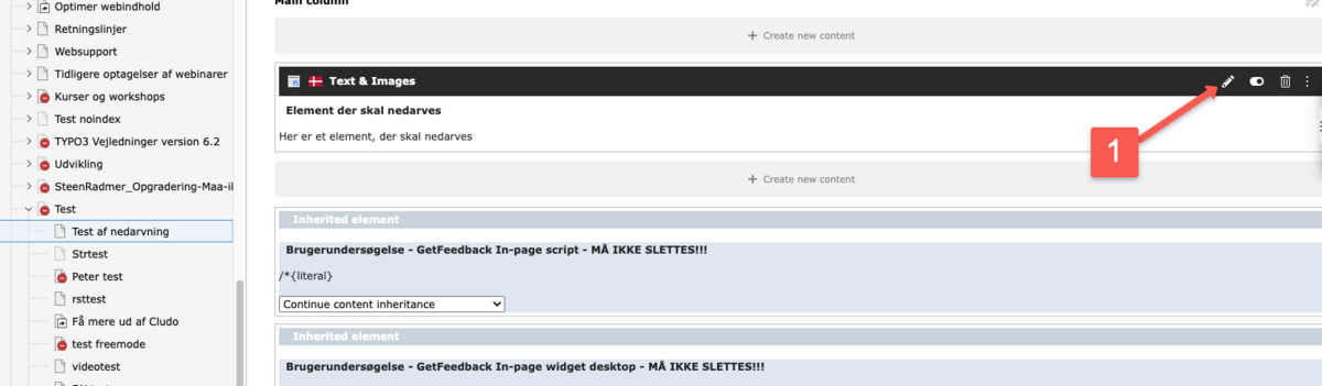 1) Klik på den side, hvor det indholdselement, der skal nedarves, er placeret. Find frem til det rigtige indholdselement, og klik på blyanten for at redigere det.