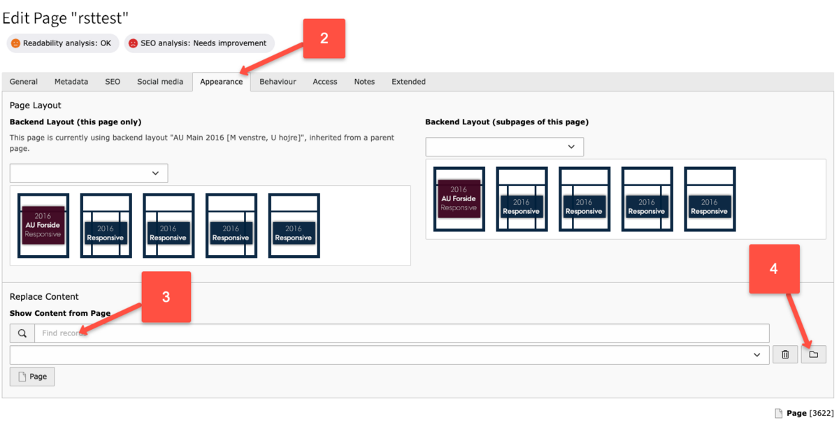 2) Vælg fanebladet Udseende. 3) Under Replace content vælger du, hvilken side du vil udstille indhold fra ved at skrive sidens id-nummer og vælge den på listen. 4) Alternativt kan du navigere dig frem til siden. Husk at gemme, inden du lukker siden.