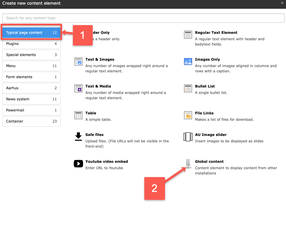 1) Vælg fanebladet Typisk sideindhold. 2) Tryk på “Global content”