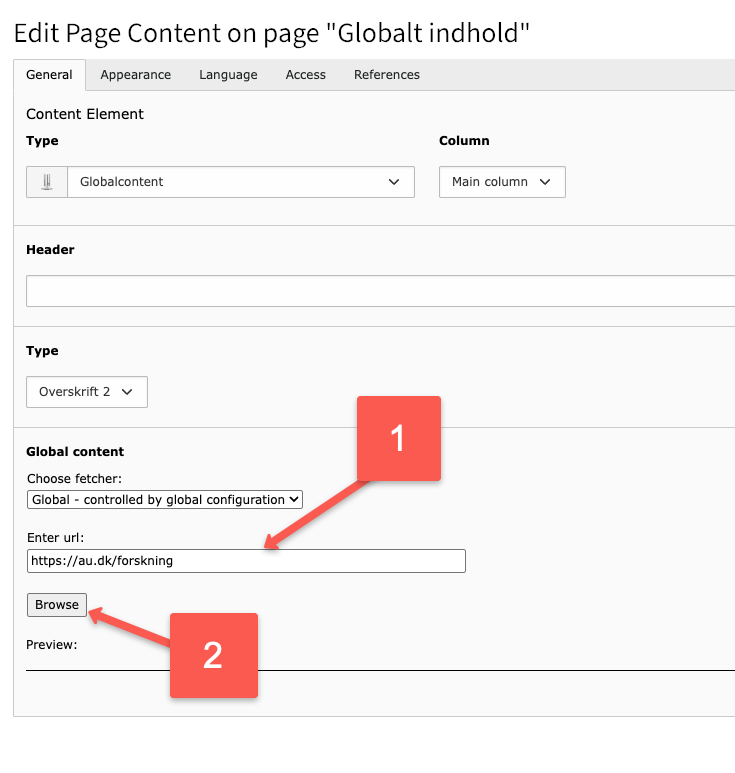 Globalt indhold er en reference til et sideelement, som du ikke har adgang til som redaktør. Du kan altså bruge “Globalt indhold” til at lave referencer til elementer på en hvilken som helst side på AU’s hjemmeside. Når man opretter et globalt element, vil man have en permanent reference til dette indhold, som opdateres automatisk, når kilden bliver opdateret. Hvis redaktøren på det andet site helt sletter elementet, vil det heller ikke blive vist hos dig.