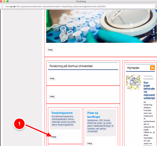 Der åbnes et pop-up vindue, hvor der ud for hvert enkelt sideelement er en “vælg” knap. 1) Vælg det element der skal refereres til ( i dette tilfælde elementet forskningscentre). Når du har valgt elementet, lukker pop-up vinduet igen. Gem siden og der vil nu være en reference til det valgte indhold.