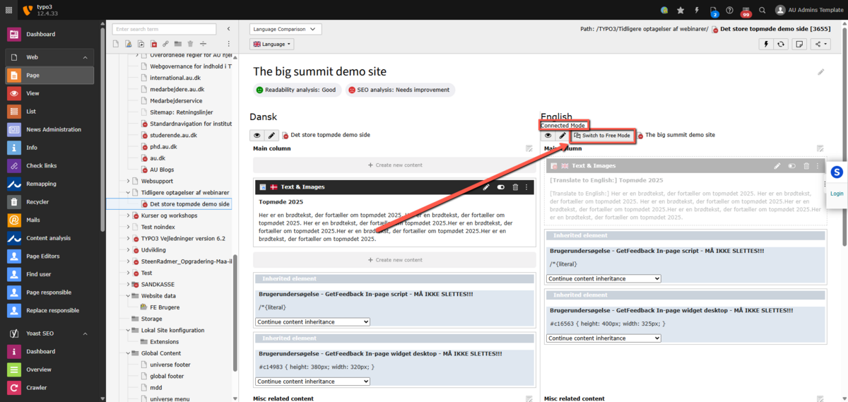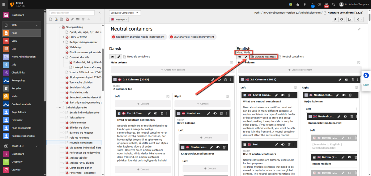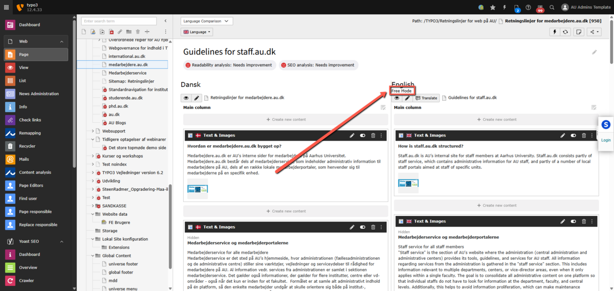 2. Man befinder sig i Fri tilstand (Free mode) og har oprettet et indholdselement (+ Content) på den originale side og oversætter elementet vha. sprogmenuen øverst (English [NEW])