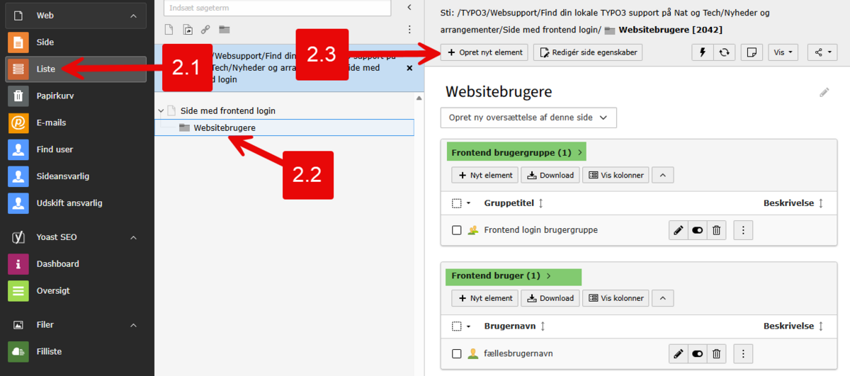 I Mappen med website brugere skal du nu oprette to nye TYPO3 elementer (markeret med grønt) på følgende måde: