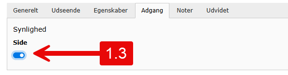 Den eneste forskel på at skjule en side fremfor et element er, at du i stedet for at redigere Adgang for det enkelte element skal redigere Adgang for siden i sidens egenskaber. Ellers kan du følge punkterne 5.1-5.3 ovenfor.