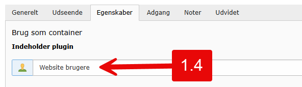 1.4 Vælg fanebladet Egenskaber. I den lille menu Indeholder plugin vælges Website brugere.