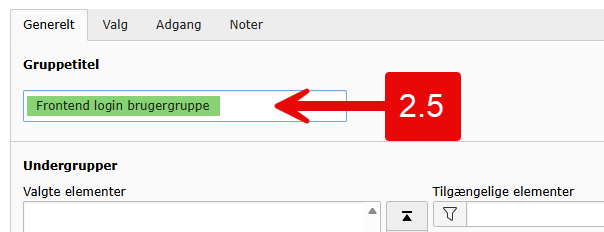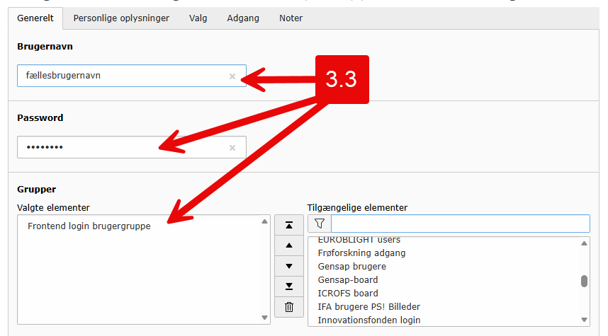 3.3 Under fanebladet Generelt skal du nu gøre følgende: Indtast det fælles brugernavn og fælles password, som du vil udlevere og dele med de brugere, som skal kunne logge sig på. Klik efterfølgende på gruppens titel under 'Tilgængelige elementer' og find den titel, du gav gruppen under punkt 2.5 (se pil nr. 2.5 ovenfor, hvor brugergruppen i dette eksempel er navngivet "Frontend login brugergruppe"). Bemærk, det er dig, som bestemmer brugernavn og password, og det valgte brugernavn og password har ingen relation til andre login-informationer på AU.